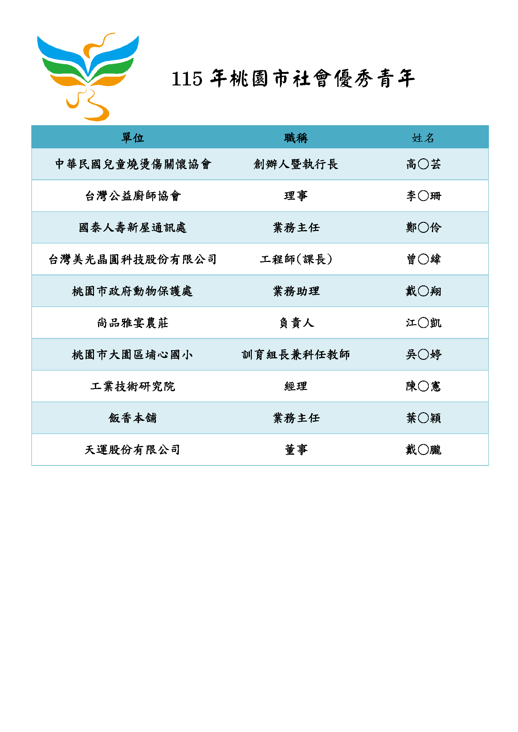 恭賀115年桃園市社會優秀青年